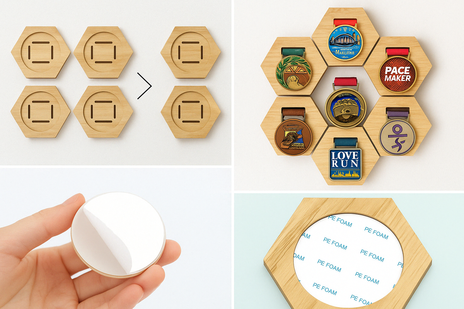 Ces présentoirs muraux en bois au format hexagonal sont conçus pour mettre en valeur tes médailles de course, triathlon, CrossFit, ou tout autre exploit sportif. Empilables et modulables façon “nid d’abeille”, ils transforment ton mur en un véritable mur de gloire.